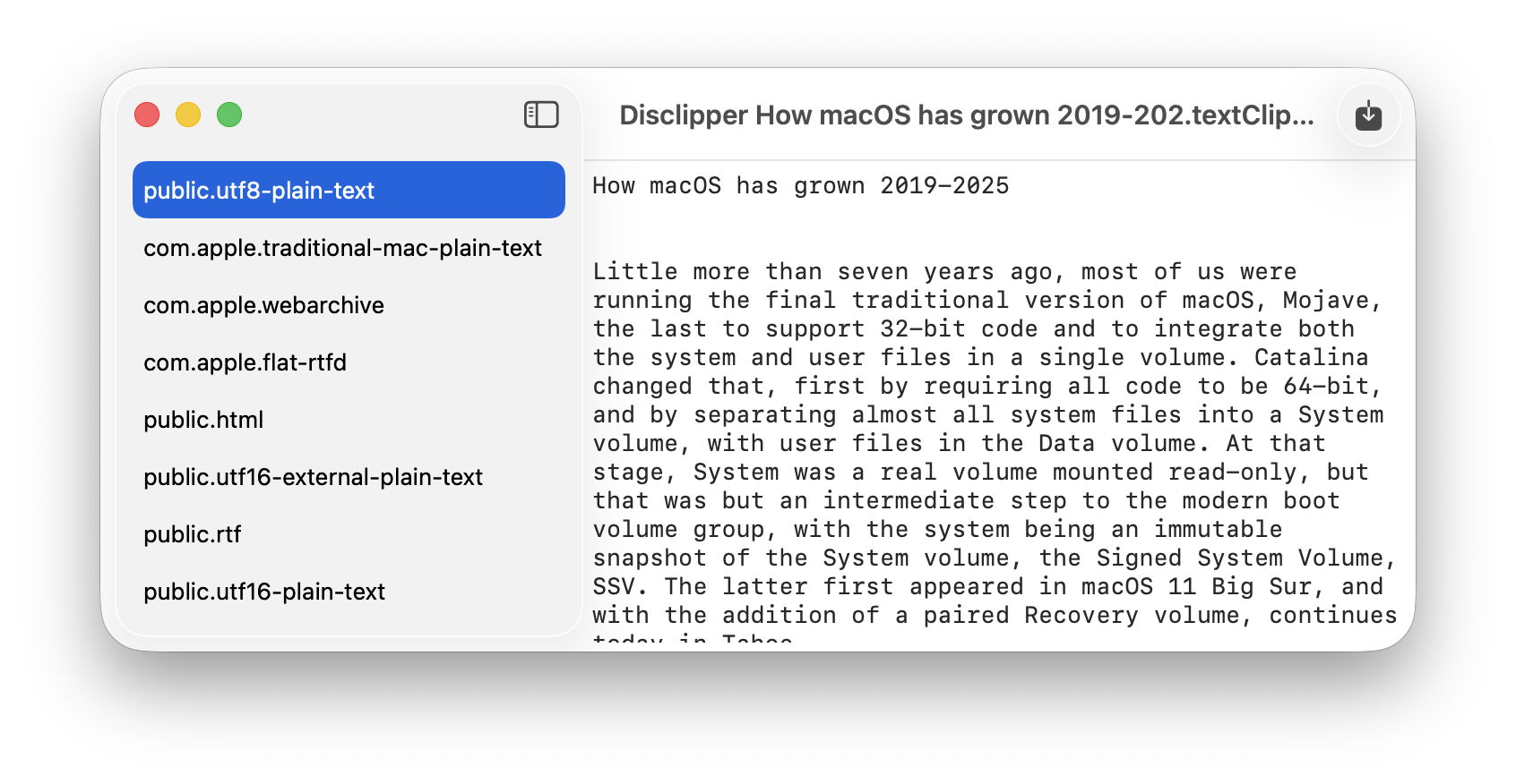 Drop that textClipping file onto Disclipper’s window, and you’ll have the option to save its contents in several formats including WebArchive, RTFD and HTML. Try each of those: