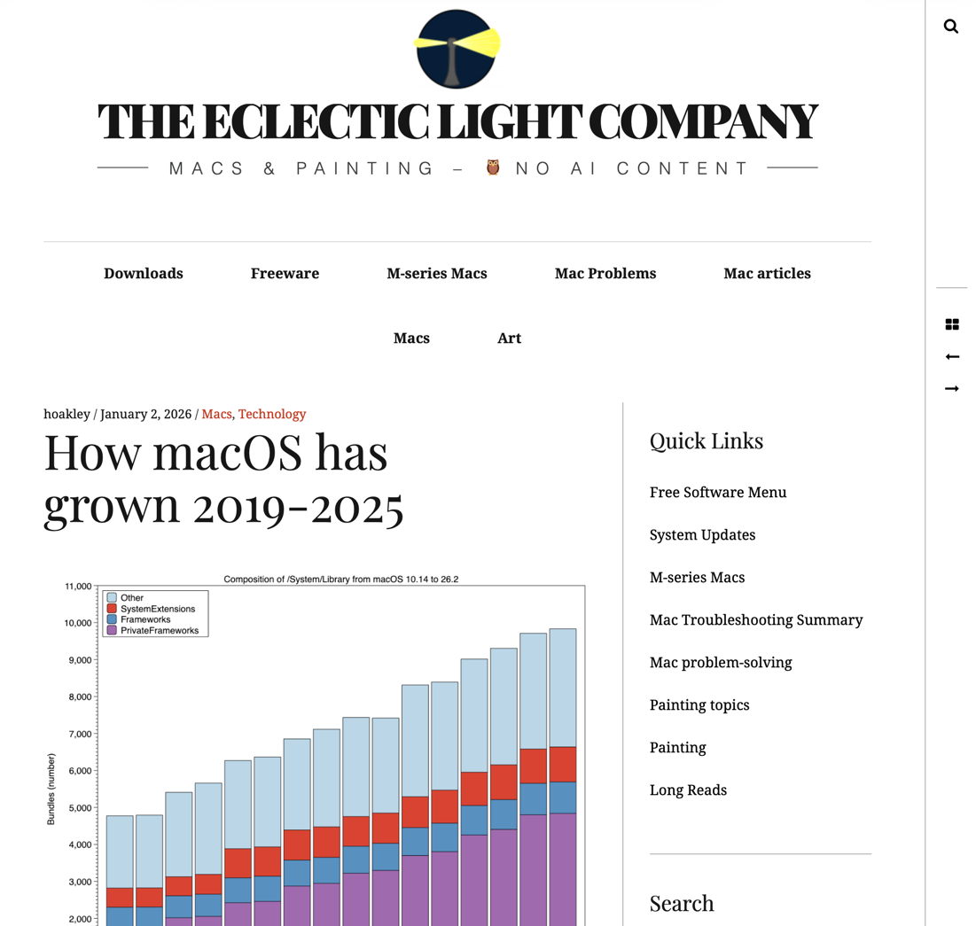 I first looked in detail at how to archive webpages in Safari over three years ago, when I concluded that exporting to PDF was best, and confirmed that when I revisited the question a couple of months ago. One of the snags with those methods is that they not only save the article you want to preserve, but along with it comes all the furniture, including menus, search, lists of archives, tags and more. Rather than making a replica with all that overhead, why not select just the article we want to save?