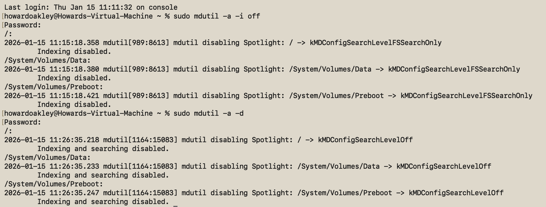 as that disables both Spotlight searches and Spotlight indexing, and appears to be effective on the current Data volume. mdutil will then inform you that indexing and searching are disabled on each mounted volume, and Spotlight has been switched to kMDConfigSearchLevelOff. That ensures all attempts to search will fail to return any hits.