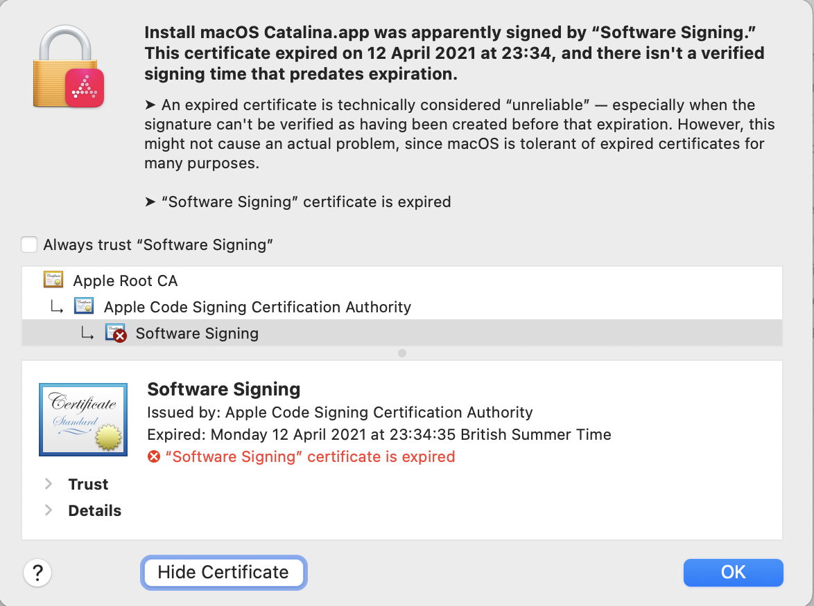 Some certificates, most notably those used by macOS installers and updaters, also rely on the intermediate Apple Worldwide Developer Relations certificate, which underwent a hiatus on 24 October 2019 when an old certificate expired and was replaced by a new one, which expires on 20 February 2030. That expiry will still limit the validity of some old signatures.