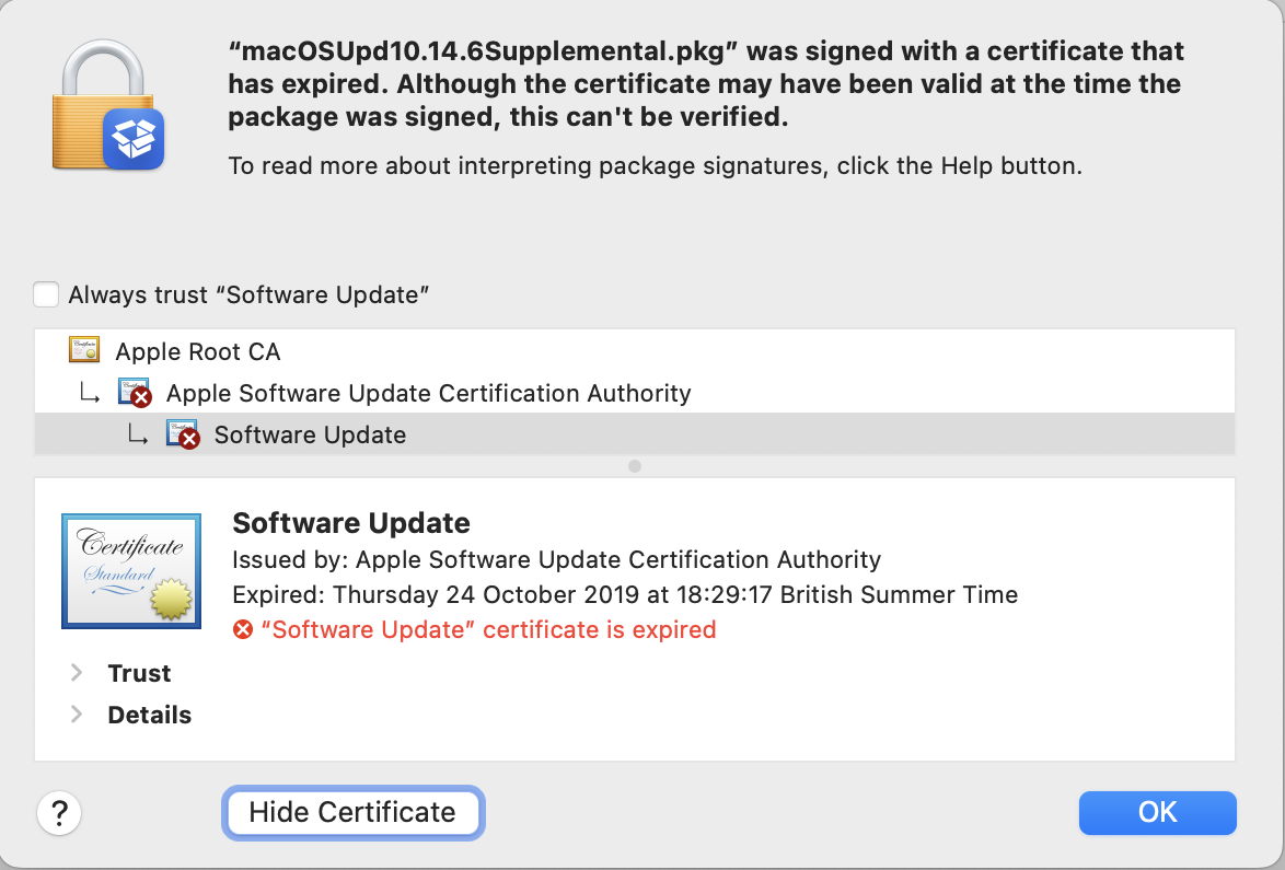 This macOS update installer package was also signed without a trusted timestamp, its certificate expired in the 2019 hiatus, and it’s now unusable.