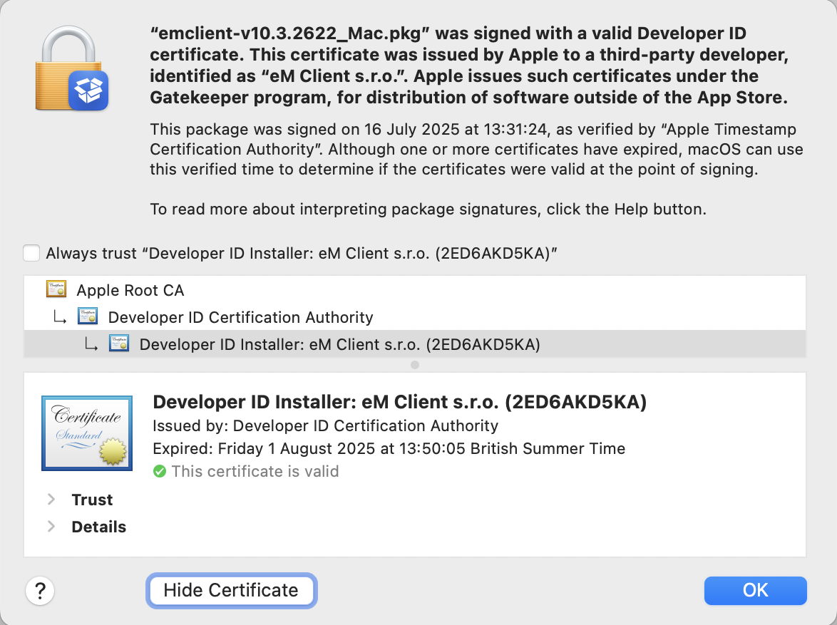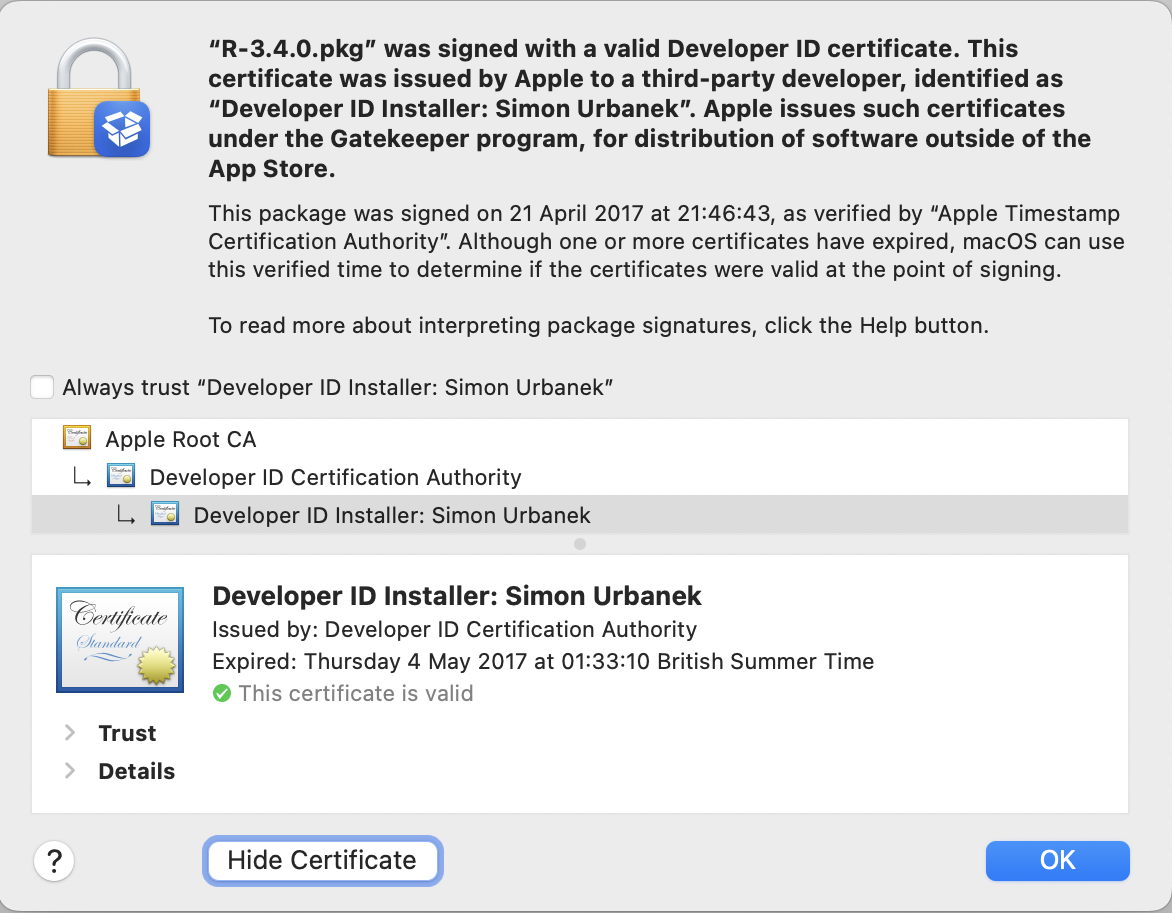 This third-party installer package was only signed last July, but its Developer ID Installer certificate expired the following month. Because its certificate was valid at the time of the trusted timestamp it’s still deemed valid.