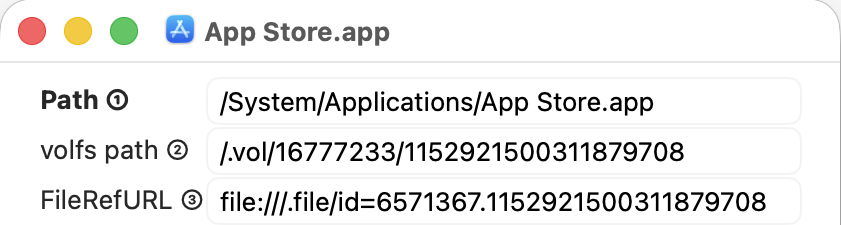 The App Store app has a different path, starting from /System, indicating that, although it might appear to be in the main /Applications folder, in fact that app is in the Signed System Volume (SSV) rather than the Data volume. The Finder agrees with this, and there’s added confirmation in the inode number of 1152921500311879708, which really is vast, and much larger than that of the Alfred app. As this app is part of the System, we can’t copy, move or remove it.