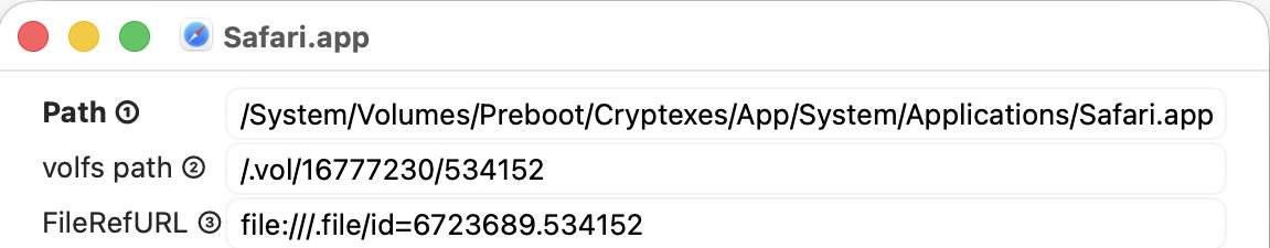 Although the Finder tries to pretend this is alongside Alfred in the main /Applications folder, the path given by Precize is way off that, and gives its own clue that Safari is actually in the apps.dmg cryptex, which is here grafted into a folder in the Preboot volume, so in neither the System or Data volume. However, it has a very low inode number of 534152 indicating it has been grafted into that path. The other number, given before the inode number, is also different, and corresponds to the Preboot volume, rather than either of the volumes in the boot volume group.
