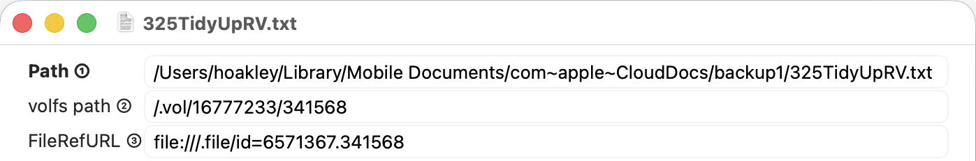 While the Finder will continue its pretence that it’s in something called iCloud Drive, in fact it’s tucked away in a nest of folders inside your Home ~/Library folder. This means it’s on the Data volume, and it too has a low inode number of 341568 to confirm that, and the same volume reference number as Alfred and the App Store apps, but different from that of Safari. Of course, there’s also a copy of that file’s details and its data held in iCloud Drive, to which you don’t have direct access.