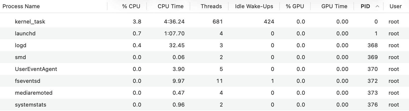 At the top with PID 0 you’ll see kernel_task, followed by launchd with a PID of 1. Next you’re likely to see the logd service responsible for writing and maintaining the Unified log. On Intel Macs that’s likely to have a PID of around 96, while it’s higher on Apple silicon Macs at around 368. That’s because of the many hardware-related processes that are run during startup to initialise all the features built into the chip.