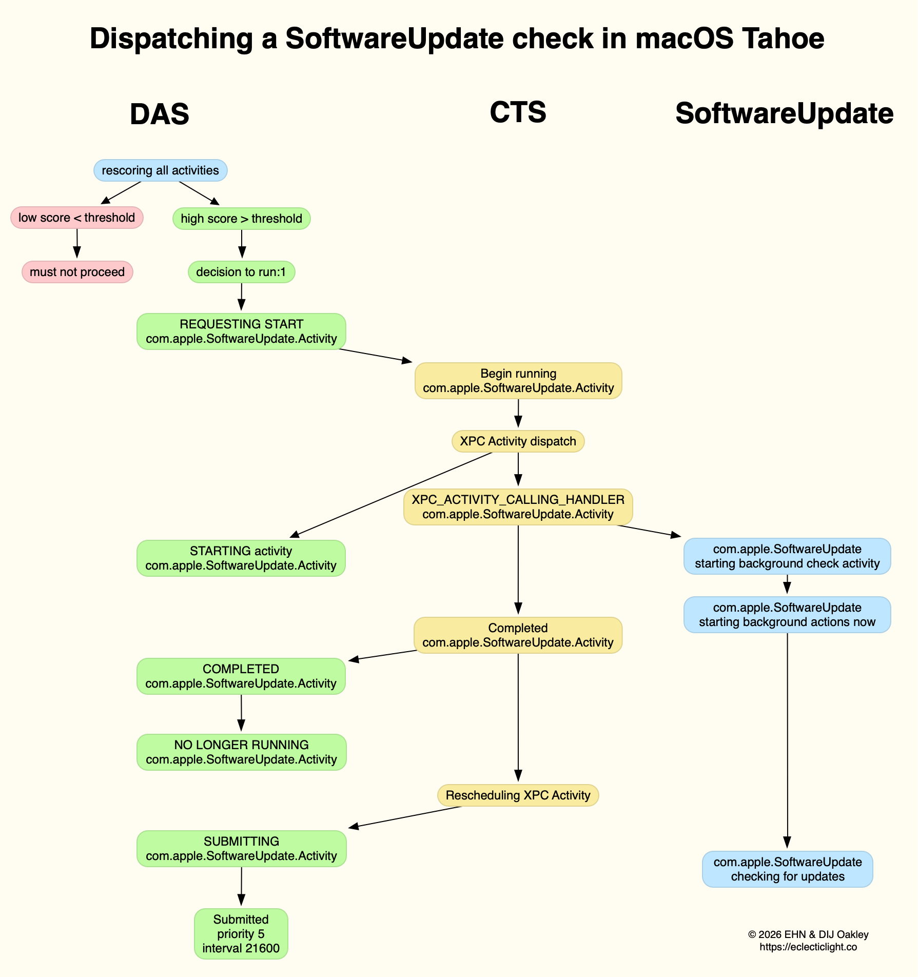This normally reaches a score sufficient to be dispatched in the first few minutes after user login. That DecisionToRun is recorded in the log, and DAS requests CTS to start com.apple.SoftwareUpdate.Activity as root via XPC. This starts a dialogue between DAS and CTS, leading to the handler com.apple.SoftwareUpdate being called. That in turn starts its background check, and proceeds to check for updates.