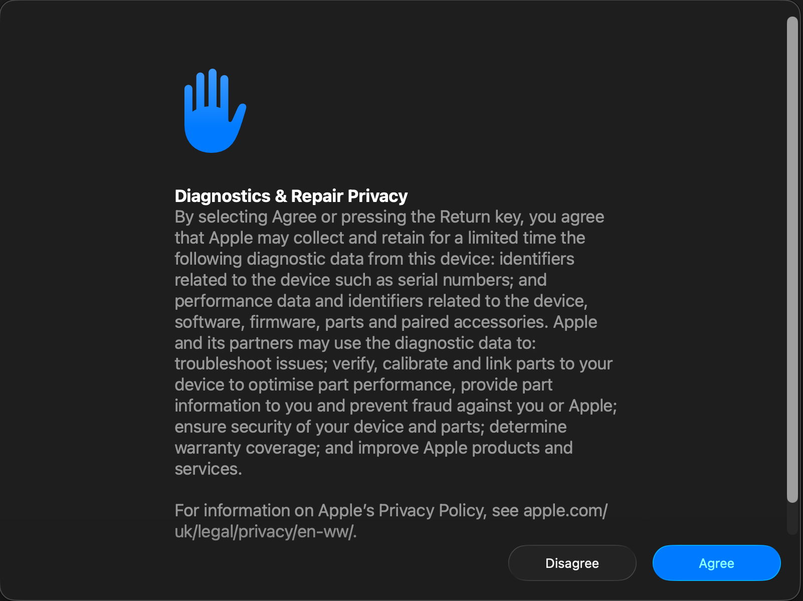 Apple Diagnostics used to be the only part of Recovery that still relied on a keystroke command in Apple silicon Macs, and that hasn’t changed. Before starting your Mac up, if it’s a laptop connect its mains power adaptor if possible, and that will be included in the tests. Then press and hold the Power button until Recovery starts loading. Once it appears, press and hold the Command ⌘ and D keys until you hear the startup chime indicating the Mac has rebooted into Repair Assistant.