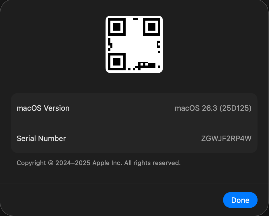 Repair Assistant’s substitute for an About window provides details of your Mac, including its serial number, and the version of macOS. Its QR code (lightly defaced here) simply provides the serial number in an accessible way.