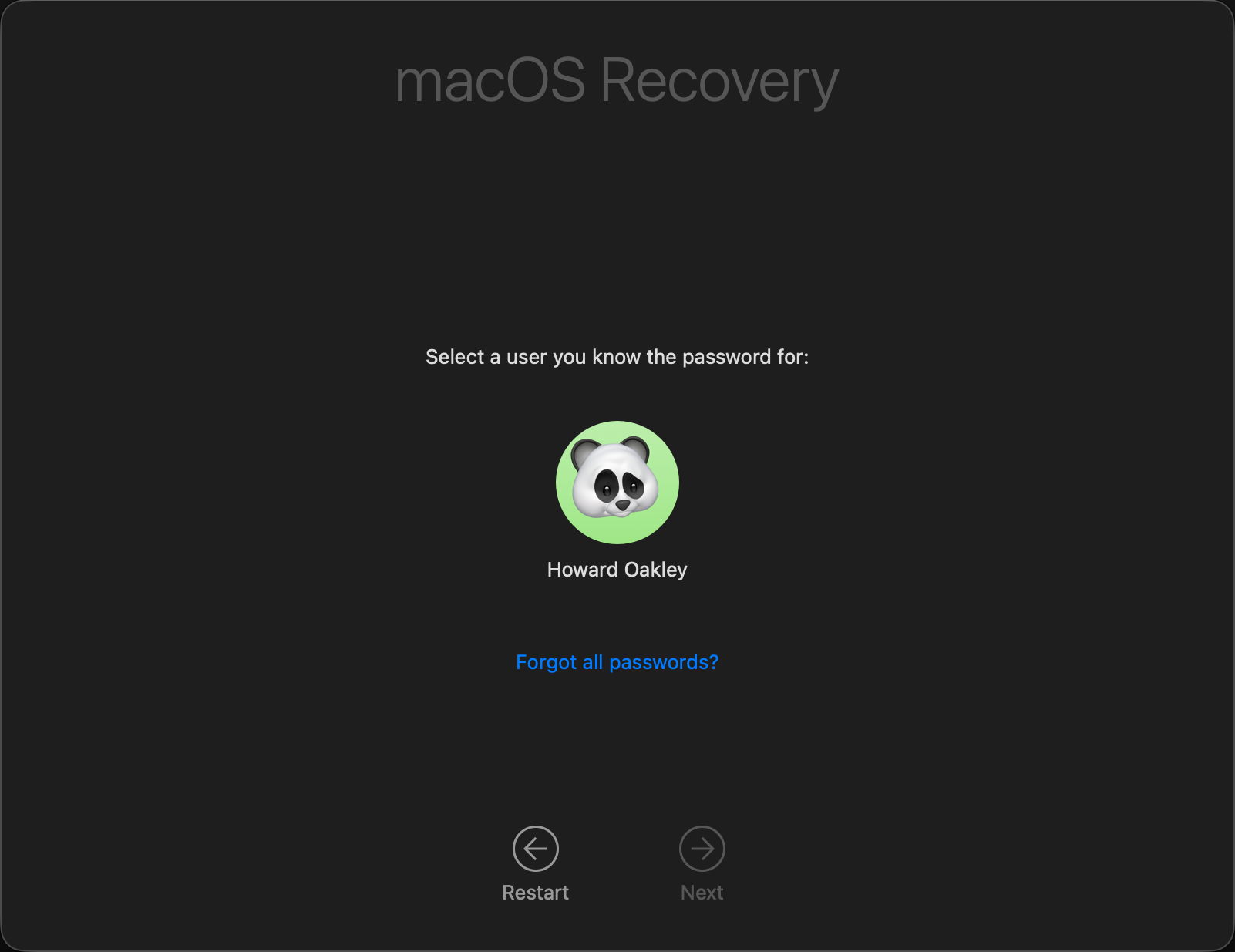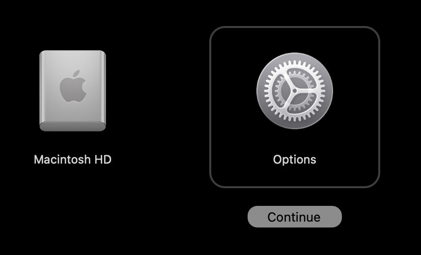 Select the Options icon and click Continue underneath it. You will then be prompted to select a user you know the password for. Do that and click on Next. Enter the password for that user and click Continue.