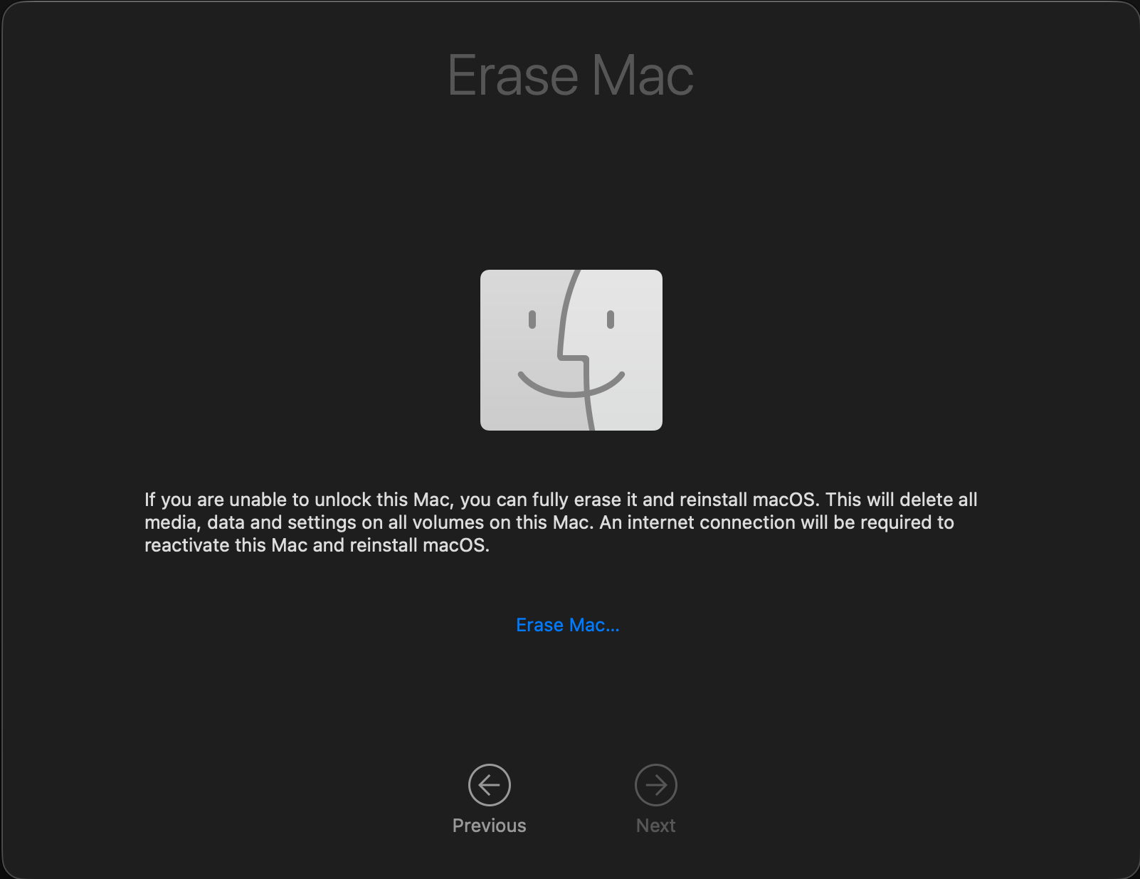 To erase the Mac fully without unlocking it, select that command from the Recovery Assistant menu. This completely erases all boot volume groups on the Mac’s internal SSD, ready to reinstall macOS, for which it requires an internet connection.