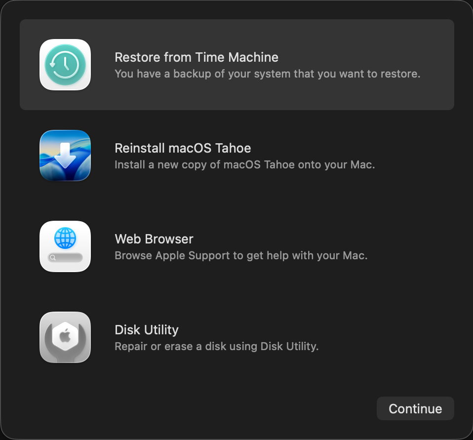 To read Apple’s help information on Recovery Mode and its tools, or browse the web, select Web Browser and click Continue.