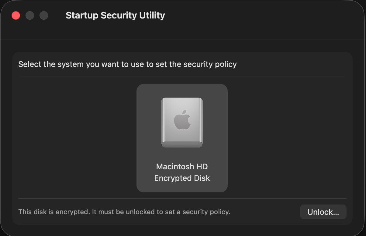 To change the Security Policy for a boot volume group, open Startup Security Utility and select the boot volume group whose policy you want to inspect or change. Click Unlock and enter the password for that.