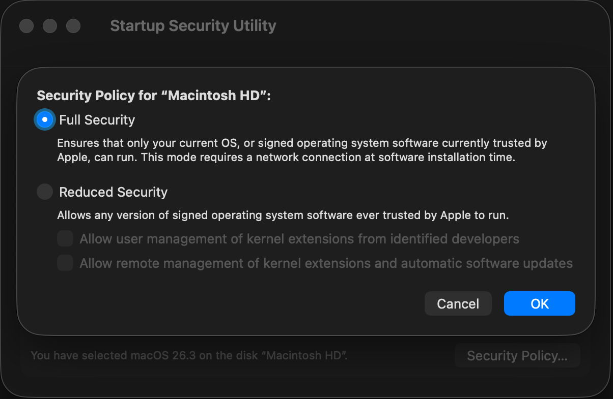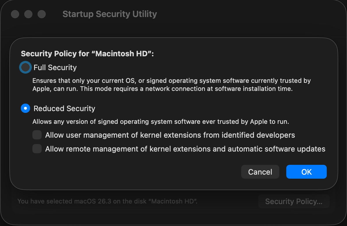 To run that boot volume group at Reduced Security, for example to allow the loading of third-party kernel extensions, select Reduced Security instead, then tick the option you want and click OK.