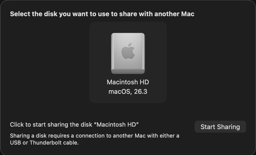 To put that Mac’s disk into Shared Disk mode, select the Share Disk… command from the Utilities menu and follow the instructions.