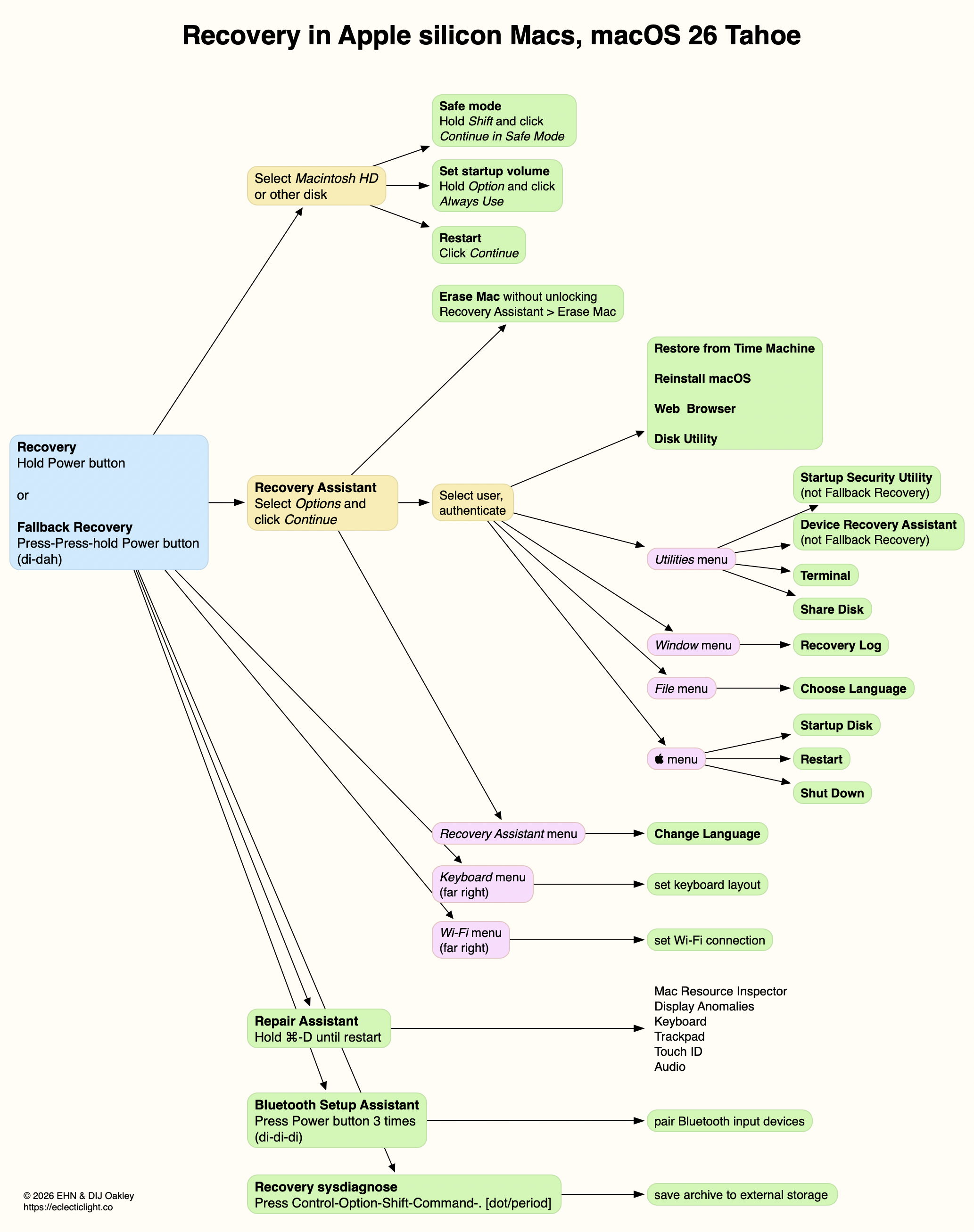 There have been substantial changes made to Recovery for Apple silicon Macs in recent versions of macOS. This article guides you through its increasing complexities, using the road map below.