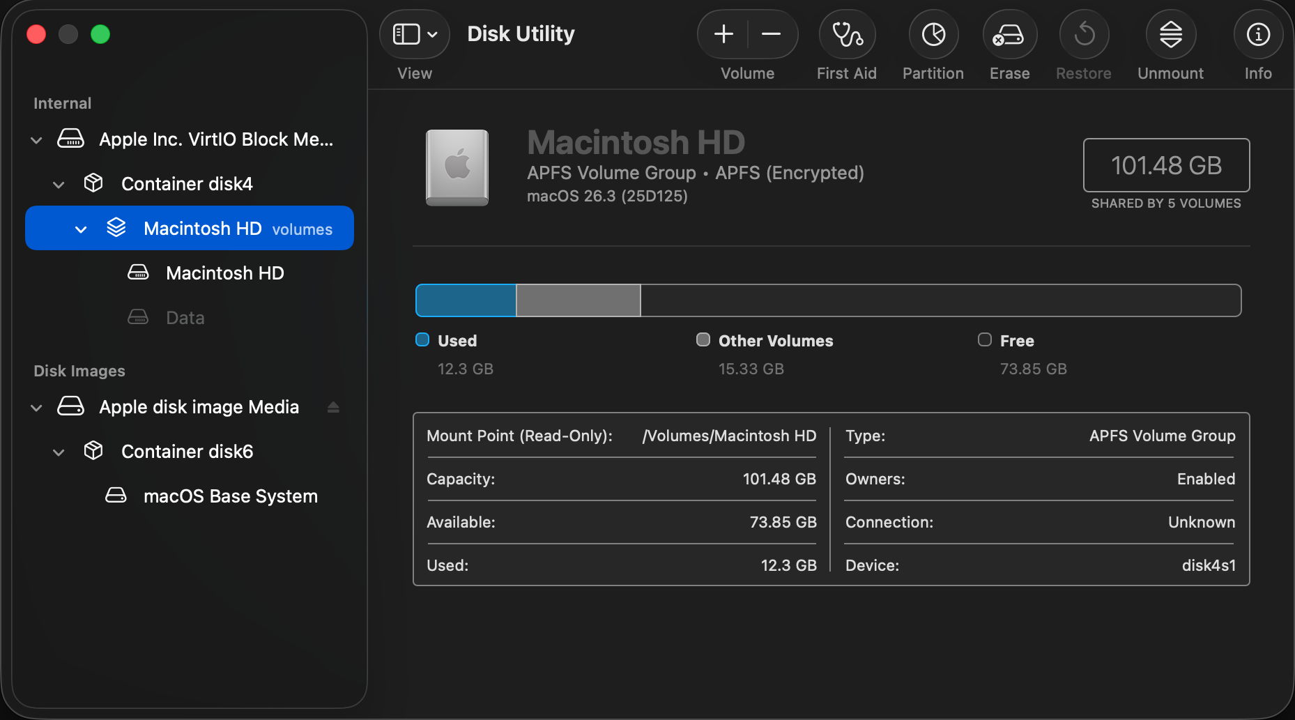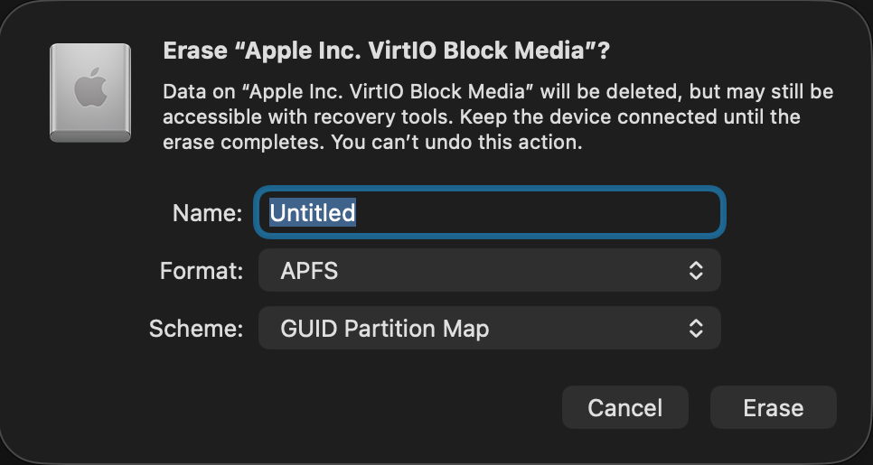Some instead select the disk at the top of the list at the left, here named Apple Inc. VirtIO Block Media because it’s running in a VM. In theory that should completely reformat the internal SSD, wiping all three of its containers, and so require a more extensive reinstallation. In many cases, it’s preferable to Restore in DFU mode, to ensure the whole of the firmware is replaced at the same time.