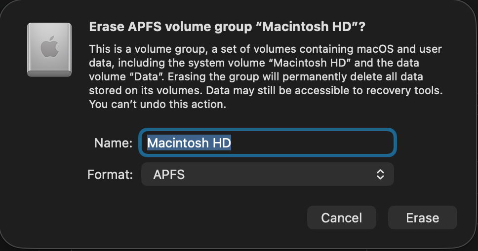 Select Macintosh HD at the left and click the Erase tool at the top of the window. Enter a name for the volume such as Macintosh HD, select APFS as the format, and click the Erase or Erase Volume Group button.
