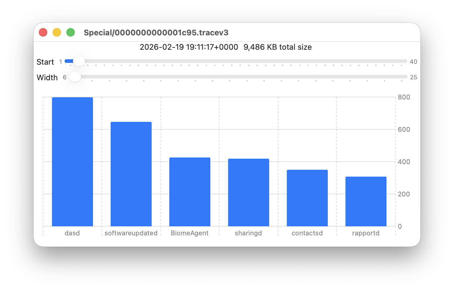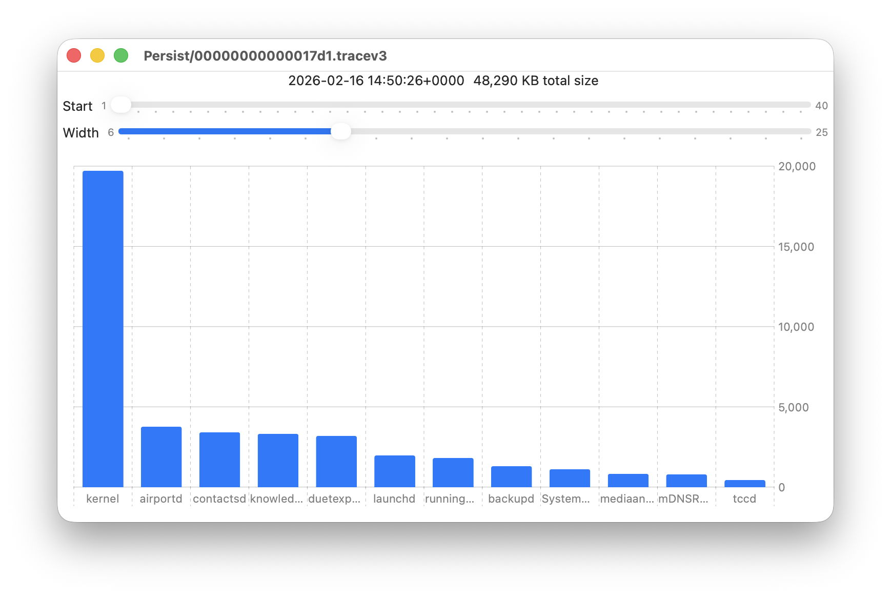 - Width sets the number of bars to display, ranging from 6 to 25. The more shown, the harder it is to read the names of processes at the foot of each bar, and the less precisely you can read the size of their log data at the right.