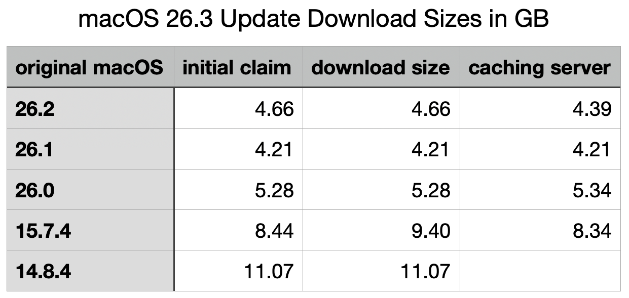 Software Update also reports two update sizes to the user: the first is given as a promise prior to the user initiating the update, the other displayed above the progress bar during downloading, in the progress window. A third figure can also be derived by obtaining the update through a local Content Caching Server. Results obtained for the update to 26.3 are shown in the table below.
