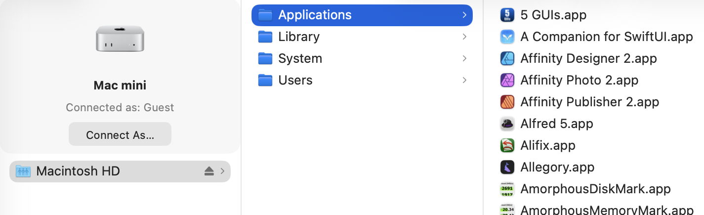 On the other Mac, that shared volume should appear as a networked device, connected as Guest, or on the Desktop. Despite that, you should have full access to its contents. This connection uses SMB, so listing large folders in the Finder will be surprisingly slow.