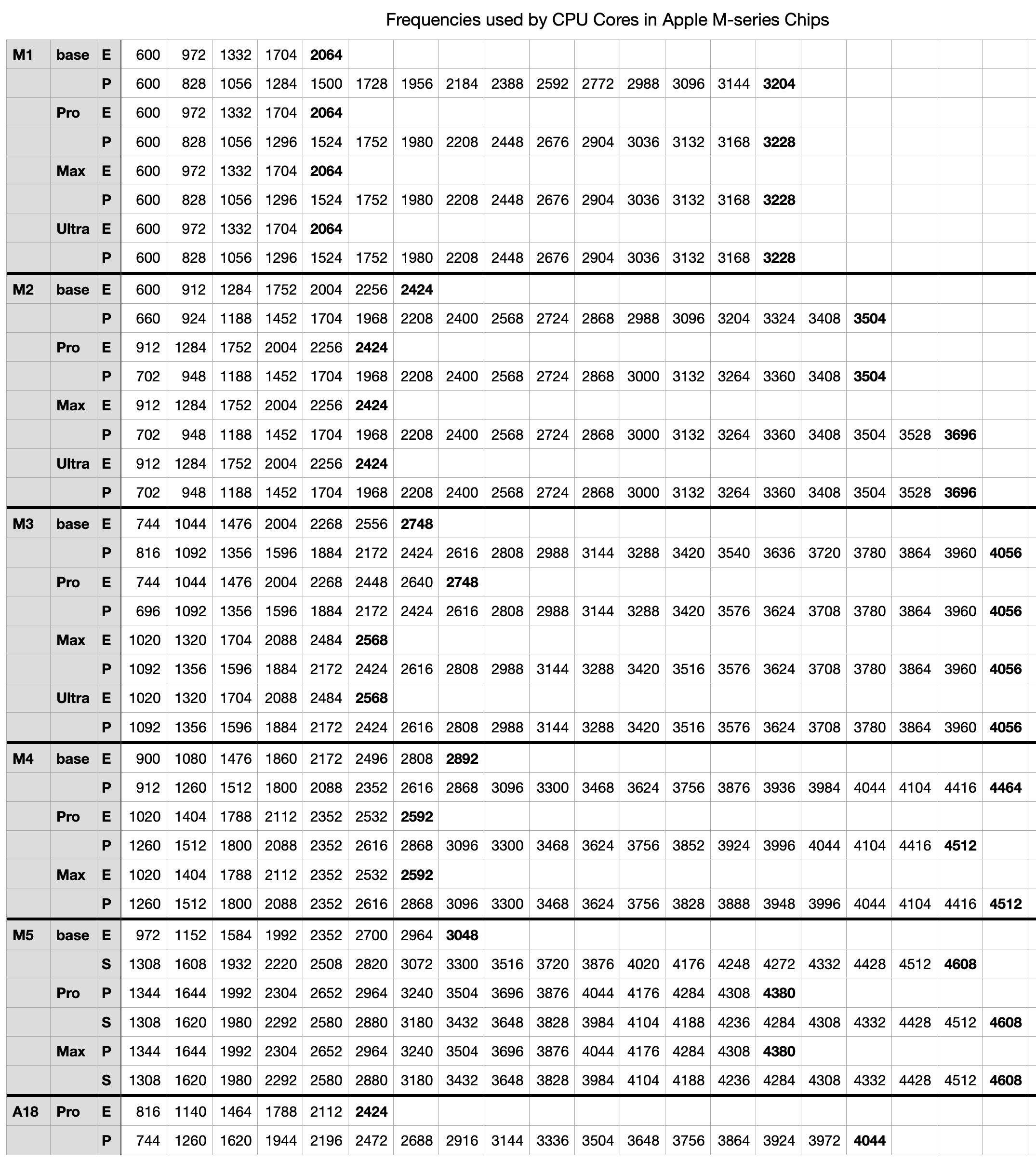 - Frequency steps for S cores in base and Pro/Max variants of the M5 differ, although both resemble those of earlier P cores.