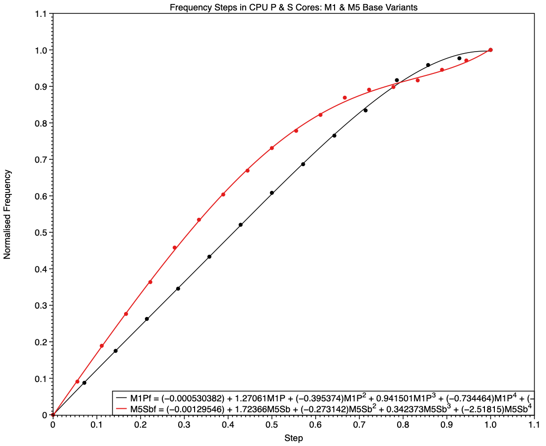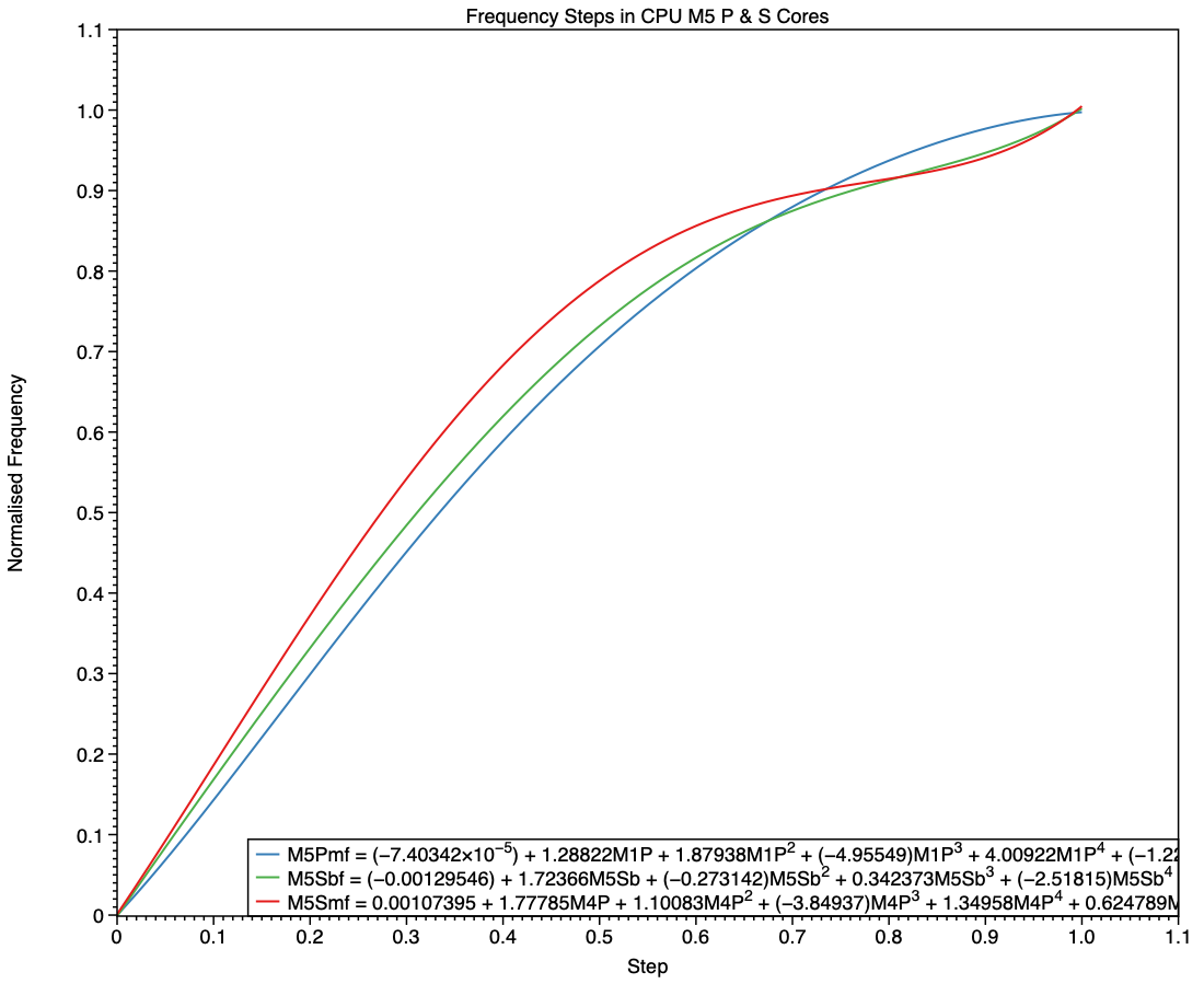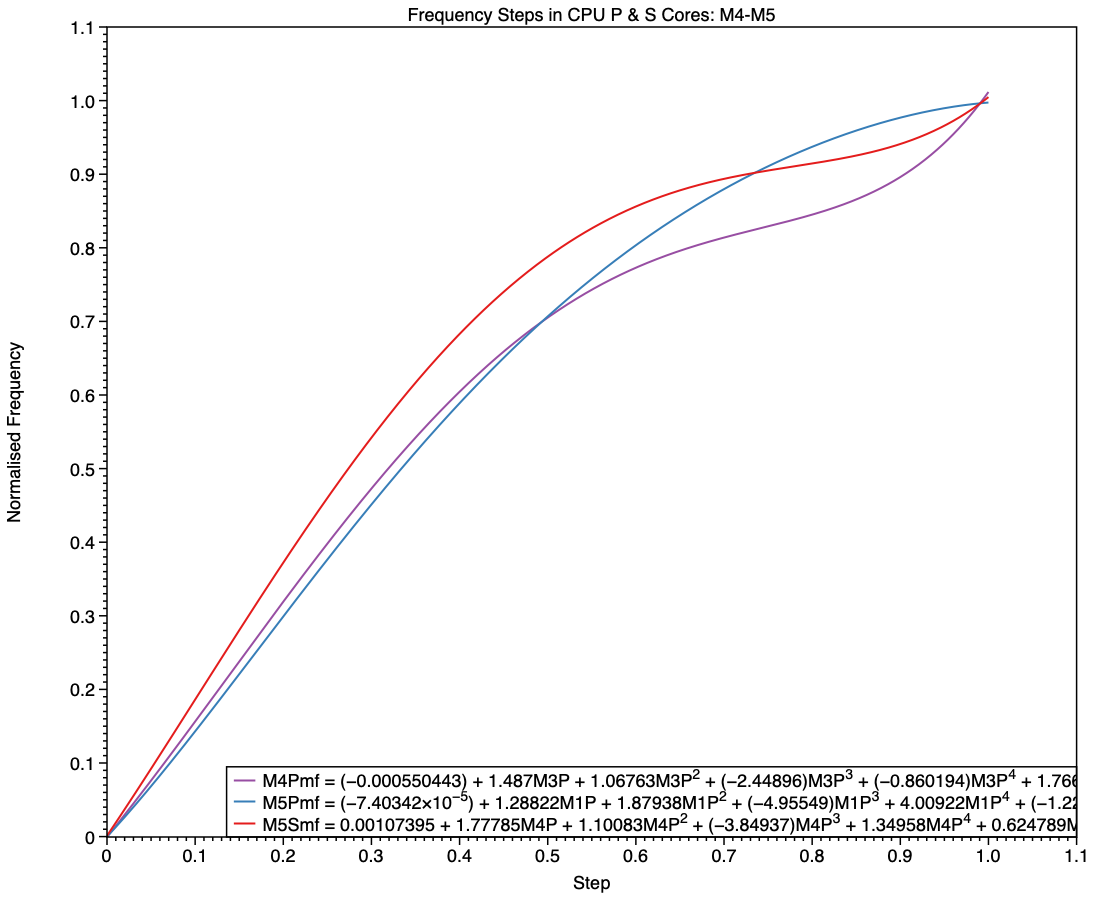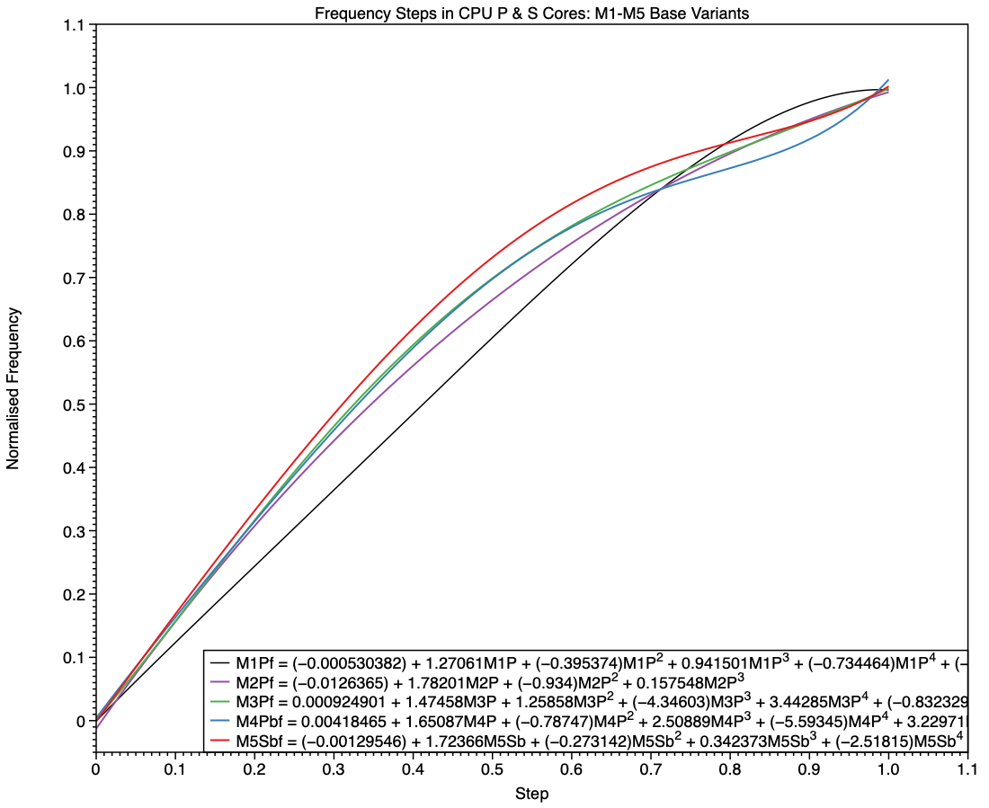 For example, say a core has an idle frequency of 500 MHz, a maximum of 1,500 MHz, and only one step between those. Its steps will be 0.0, 0.5 and 1.0, and if the relationship is linear, then the frequency set by that intermediate step will be 1,000 MHz. If it’s greater than that, the relationship will be non-linear, tending to a higher frequency for that step. The following charts compare those normalised frequencies with steps evenly spaced between that core’s idle and maximum frequencies.