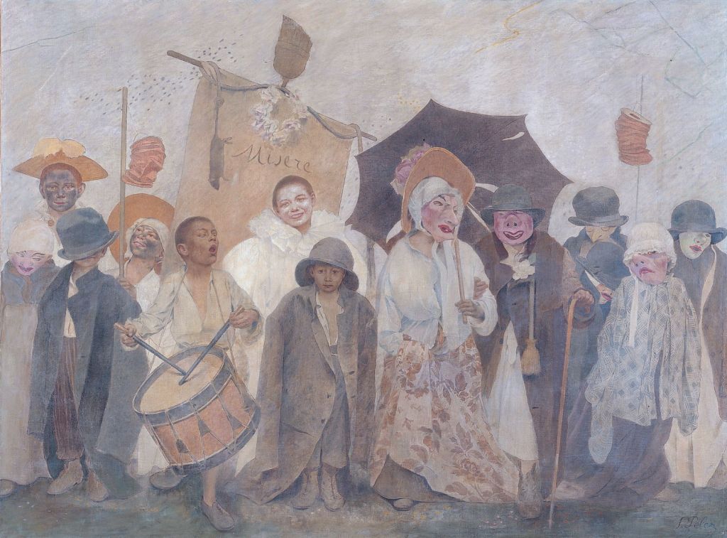 Fernand Pelez’s La Vachalcade (The Cow-valcade) from 1896 shows young revellers taking part in a carnival procession, perhaps one of those in Montmartre at the time. Several are wearing full masks.
