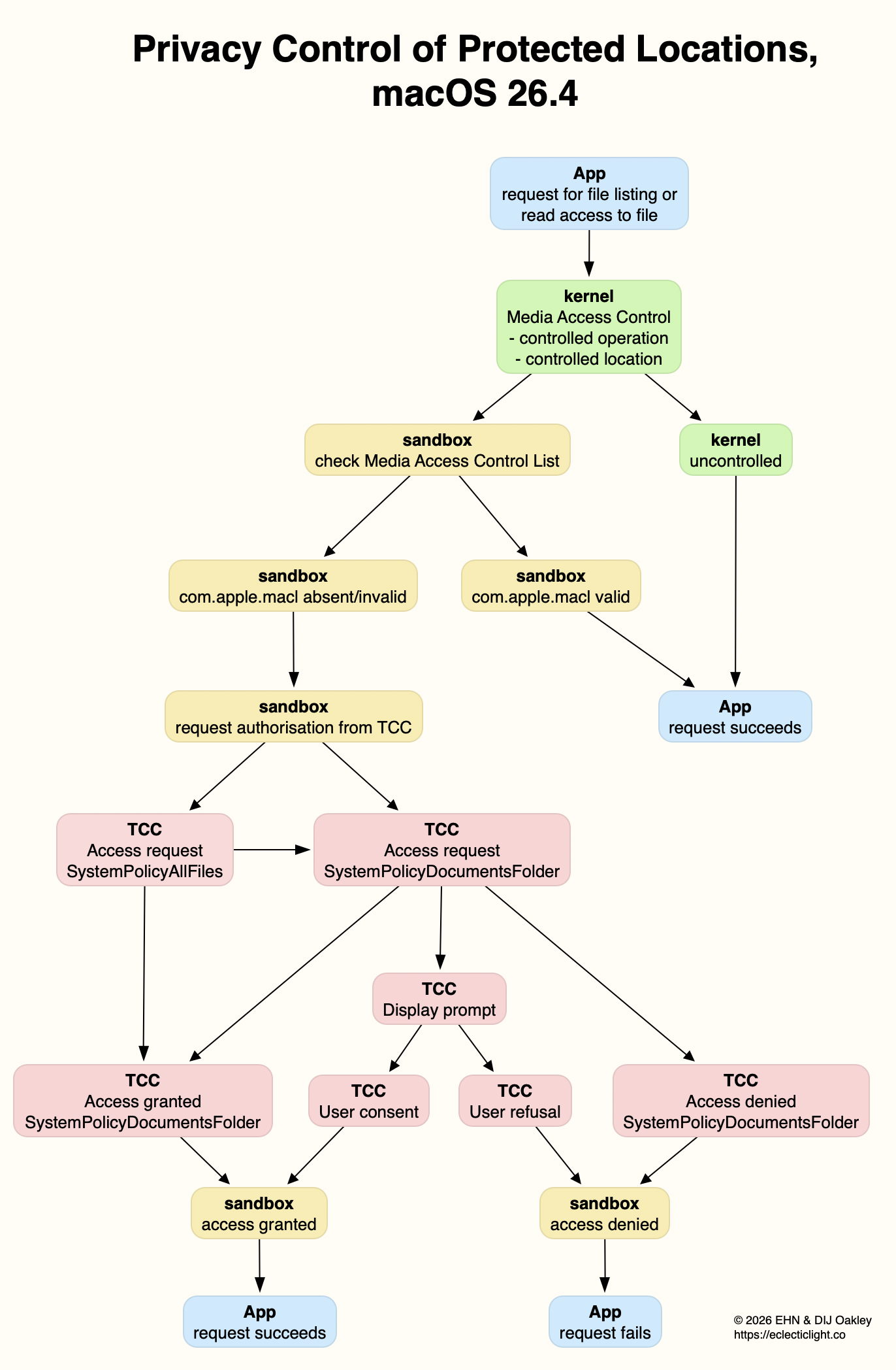 This explains why Apple has been so reluctant to document any of this, and why MACLs are so opaque. If an app were capable of creating its own functional MACLs, they would enable it to bypass TCC’s controls and gain access to any protected location. Unfortunately, the side effect is that TCC isn’t allowed insight into what the sandbox is up to, and there’s no transparency for the user.
