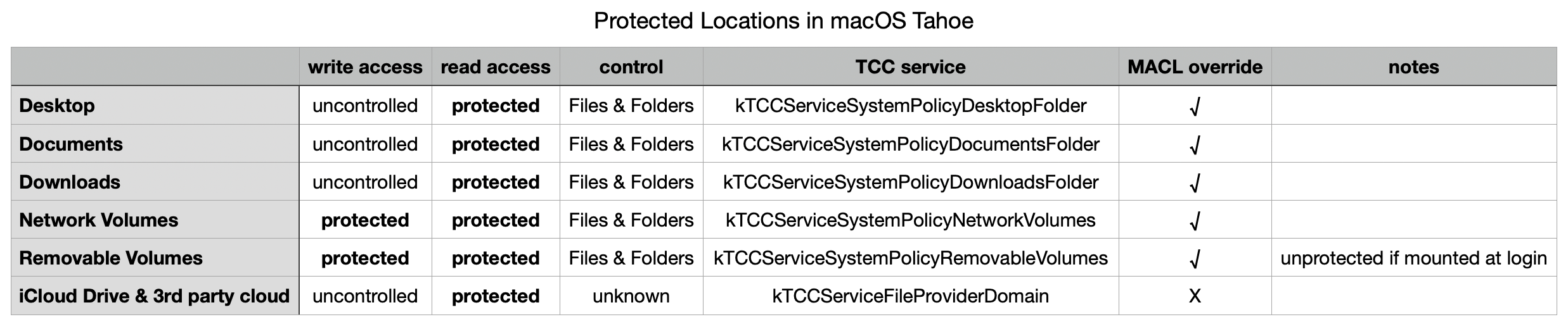 Even using a known and simple app like Insent, behaviours aren’t always consistent, and are susceptible to order effects and maybe even cosmic rays! There are also subtle differences between protected locations that can make generalisation unreliable. However, after extensive checks with Insent the following table gives an overview of protected locations in macOS 26.4.