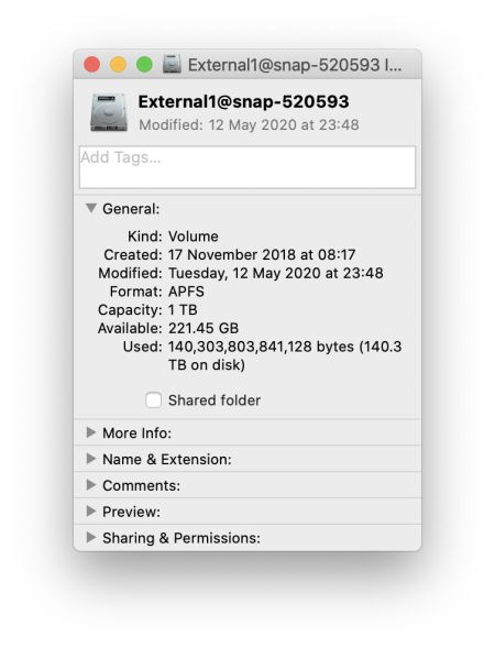 Trying to discover the effective size of a snapshot proves baffling, particularly when the Finder claims it’s almost astronomical.