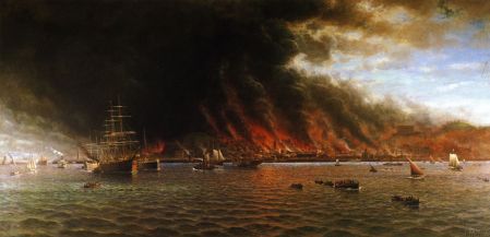 Constable and Turner both paint the burning of London’s Parliament, a scene of a prairie fire in the US, a burning castle in Denmark, San Francisco on fire in 1906, and more.