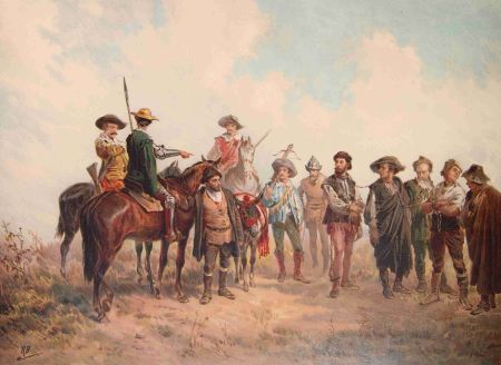 They meet 12 convicts, who Don Quixote frees before they stone him. On the run, they head for the mountains where they come across gold and a dead mule.
