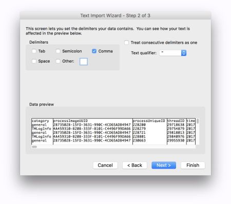 How to import complete log extracts into Excel or Numbers, using R as a conversion platform. It’s a bit convoluted, but it works.