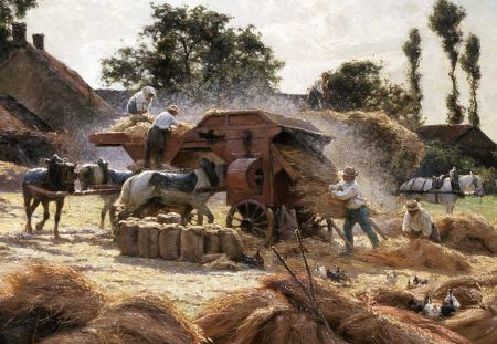 Threshing cut cereal using flails, horses towing a roller, oxen trampling the corn, a sledge, a hand-cranked machine, and a large threshing machine. With Monet’s grainstacks.