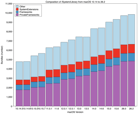 Analyses of numbers of bundles in the /System folder and significant folders within that, for macOS 10.14.5 Mojave to 26.2 Tahoe. These show how private macOS has become.
