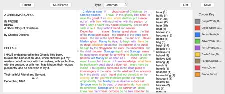 It can parse text in any combination of 8 different languages, showing parts of speech and even word roots.