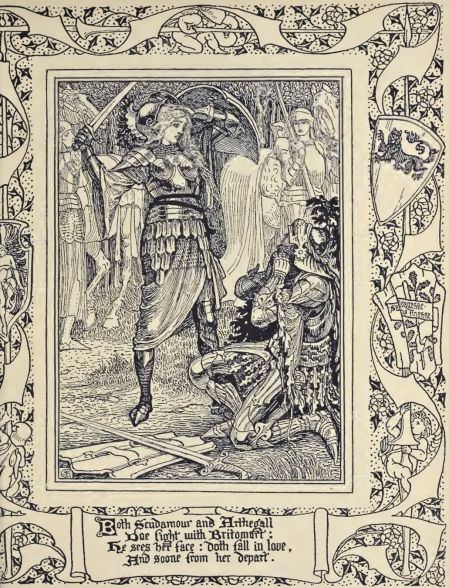 At Satyrane’s tournament for the golden sash of Florimell, Britomart emerges as the victor, but refuses the prize of the false Florimell. She meets her beloved Artegall at last.