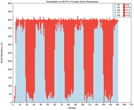 macOS virtual machines are preferentially run on P cores. Details on their performance, core allocation, frequencies and power use/